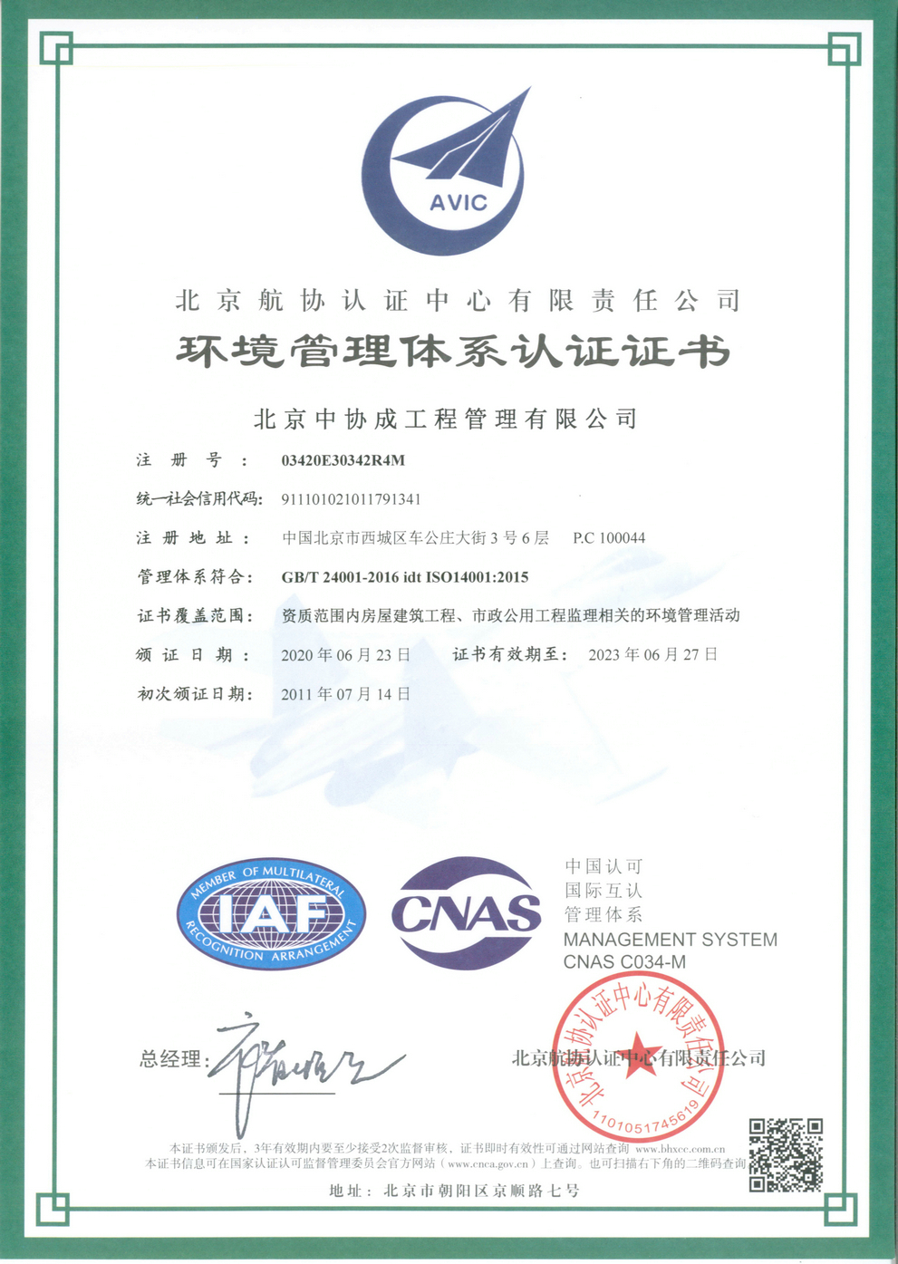 2023年北京中协成工程管理有限公司环境管理体系认证证书