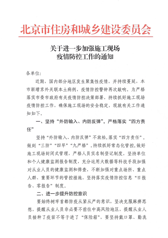 北京市住房和城乡建设委员会关于进一步加强施工现场疫情防控工作的通知