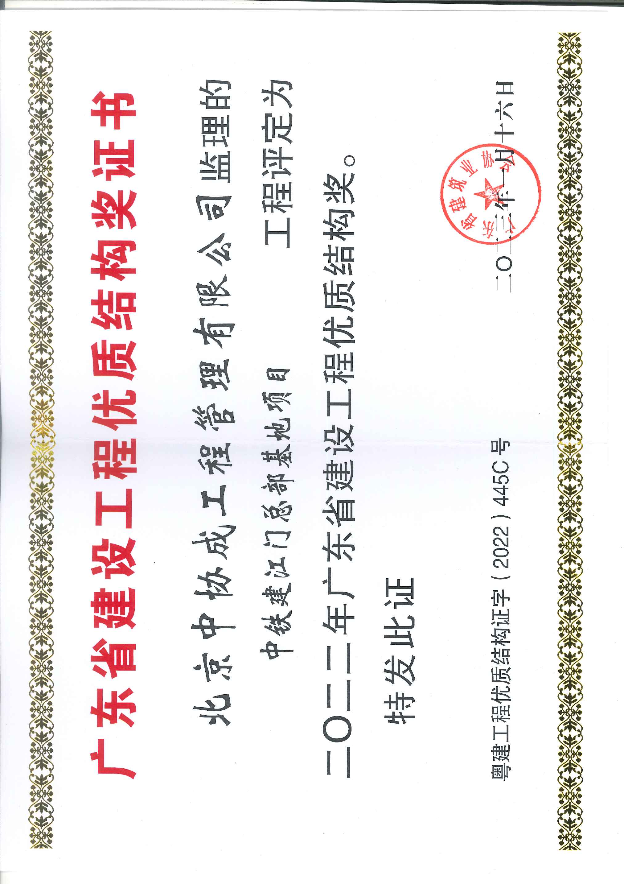 中铁建江门总部基地项目2022年广东省建设工程优质结构奖